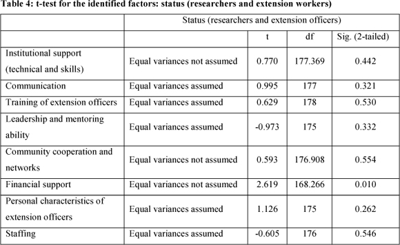 Inferential statistics, with the use of a t-test, were used to test the differences in responses to the eight factors for the variables of status (researcher or extension officer) and gender (male or female). It was found that there are significant differences between extension officers (Mean=89.79, Standard deviation=11.9) and researchers (Mean=84.11, Standard deviation=17.58) in terms of financial factors (t=2.619, p<0.05, two-tailed). In this case, the researchers indicated that finances played a more important role than the extension officers did. There were no significant differences between these two groups on any of the remaining factors. This could be the result of the locality and living expenses of the different groups, with researchers living in urban environments while extension officers generally live in rural areas. Presented in Table 4 below, is the t-test for the identified factors according to status.