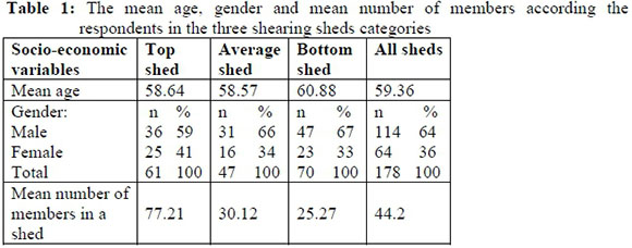 The socio-economic data is always important to indicate clearly who the respondents are and the following variables have been used: age, gender, members in a shed, educational qualification, size of farm land, livestock owned, sheep farming experience, other work experience and source of income.
