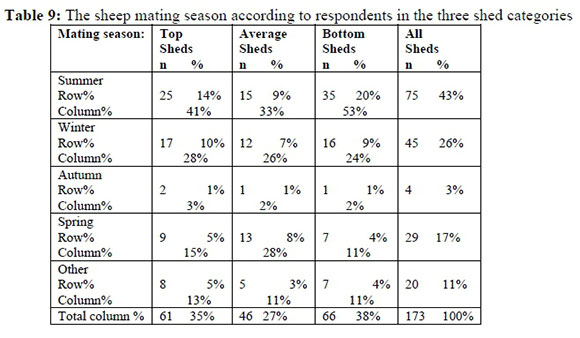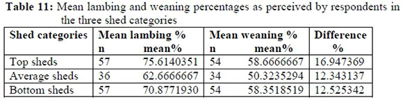 According to the above table between 13 and 17% lambs died before weaning. A worrying factor is that more lambs in the top sheds died than in the average and bottom sheds. There is a serious need to determine the best time for mating lambing and weaning in the communal areas of the Eastern Cape!