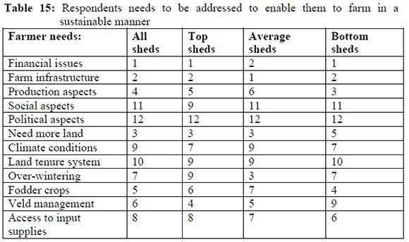 Farmers indicated the following as the four most important needs: Financial support; poor or no infrastructure; more land; and access to input supplies. Farmers need training in the importance of all wool traits. Farmers need specific advice on aspects that will add value to wool but especially to add value to meat. The identification and or the creation of a market for sheep meat are essential.