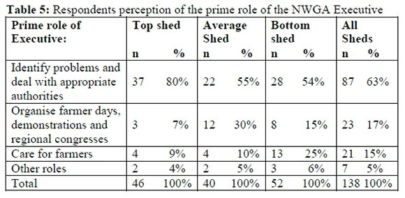 Significantly more top shed members (51%) keep records than average (27%) and bottom shed members (32%). A total of 48% of all respondents keep production records and 43% financial records. Record keeping is the main instrument to help the famer to plan for the next season, to compare it with the previous season and to identify problems. Only 32% (42) indicated that they use the records to plan for the next season while 48% indicated that they use it to compare with the previous season and 20% use it to identify problems. A total of 26% respondents did not even answer the question on how they use the records.