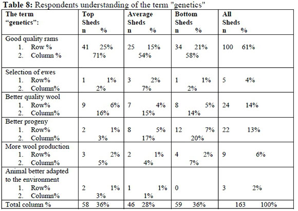 Respondents were requested to indicate their understanding of the term "genetics". The findings are presented in Table 8 below. The majority of all respondents indicated that the term genetics mean good quality rams. This is an important aspect but all the elements mentioned in the table are important and part of the term genetics. As mentioned in the introduction of the NWGA advisory service focus areas is genetic improvement and a specific program is to provide wool sheep farmers in the communal areas with rams. A total of 49% of the respondents indicated that they did get rams through the ram project.