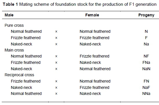 Large variations have been reported among the birds in morphological, immune response, growth and reproductive traits (Peters, 2000; Msoffe et al., 2001). This has led to the conclusion that indigenous chickens are repositories of unique genes that could be used in other parts of the world (Adebambo, 2005), hence the need for their conservation to keep genetic variation in and between indigenous breeds. A series of reports on the characterization of indigenous chickens revealed that they could be classified based on the occurrence of some major genes, such as the dwarf gene, naked-neck gene and frizzling gene (Ikeobi et al., 1996). Naked-neck and frizzle birds have been found to be thermally stress tolerant compared with their normally feathered counterparts (Nwachukwu et al., 2006). The naked-neck and frizzle genes have been found to be associated with heat tolerance, and therefore in areas with high ambient temperature, birds with these genes are superior to their normally feathered counterparts for feed efficiency (Garces et al., 2001). According to Fayeye et al. (2006), birds with the naked-neck and frizzle genes have better adult bodyweights than their normally feathered counterparts. Furthermore, many investigators have confirmed the superiority of crossbreds over purebreds regarding growth traits in chicken (Khalil et al., 2004; Nwachukwu et al., 2006).