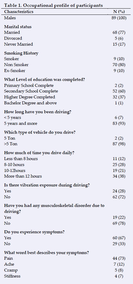 A descriptive survey study was conducted to determine the prevalence of WRMSDs among male long-distance bus drivers. Eighty-nine participants were selected to participate in the study. Participants were between the ages of 20 to 65 years, and were included in the study if they were permanent drivers, had a valid code C drivers licence and at least nine years of experience. Participants were excluded if they had sustained musculoskeletal disorders from macro-traumatic incidents (e.g. motor vehicle accident, acute traumatic sports injury). Ethical clearance for this study was obtained from the Tshwane University of Technology, Faculty Committee for Research Ethics (FCRE 2015/06/013). The data were collected using the Nordic Musculoskeletal Questionnaire (NMQ) [9] to investigate the prevalence of WRMSDs among the participants. The NMQ was chosen because of its widespread validity, and as a reliable cost-effective means of determining self-reported musculoskeletal disorders.[9] The bus company assisted in drafting a roster of available participants and communicated the available times and dates to the researcher. The researcher was present on the available days to administer the questionnaire. The researcher was the translator, assisting the participants in understanding the purpose of the study and other aspects of the questionnaire. Each participant was requested to sign an informed consent form prior to the commencement of the study. The questionnaire was administered during their break time from driving, and the participants completed it in a private environment to ensure confidentiality. The participants were instructed not to write their names on the questionnaires, thereby ensuring anonymity. The completed questionnaires were placed in a large box for further analysis by the researcher.