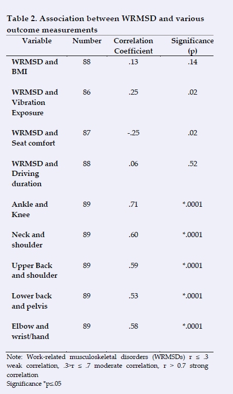 There was a weak, positive correlation between musculoskeletal disorders and body mass index (BMI), which was not statistically significant (xb = .13, p = .14). A weak correlation was further noted between WRMSDs and vibration exposure (xb = .25), seat comfort (xb = -.25), and driving duration (xb = .06). There was a strong, positive correlation between ankle discomfort and knee pain, which was statistically significant (xb = .71, p = .0001). A moderate correlation existed between pain in neck/shoulder, upper back/shoulder, lower back/pelvis and elbow/wrist (Table 2).