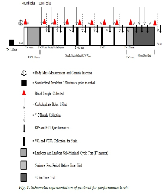 The present study aimed to determine if a superior performance is attained when a multiple carbohydrate drink is ingested. Specifically, time trial performances were compared in a single group of highly trained cyclists to determine whether a multiple carbohydrate drink (glucose: fructose in a 2:1 ratio) confers a performance advantage over that of a single carbohydrate drink (glucose-polymer only), the physiological parameters of lactate, insulin and glucose concentrations, substrate oxidation (total, endogenous and exogenous) and respiratory exchange, will be measured, which may explain the underlying mechanisms that relate to any performance differences.