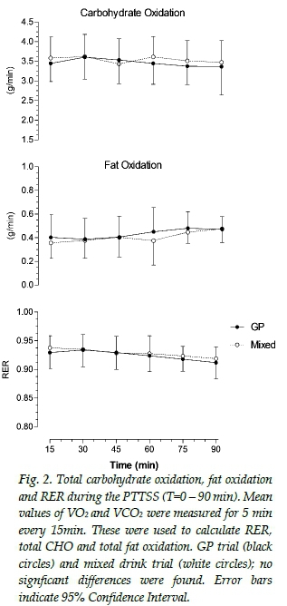 None of the measured variables (Table 1) were found to be significantly different between trials. Total carbohydrate oxidation, fat oxidation and RER during the PTTSS were not significantly different between the two trials (Fig. 2).