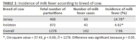 Results in Table 1 show that Jersey cows had a significantly higher incidence of milk fever than Holstein cows (p < 0.05).