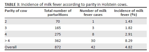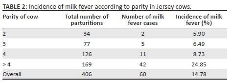 Results in Table 2 show that the incidence of milk fever in Jersey cows with more than four parities was significantly higher than those in their second, third and fourth parities (p < 0.05). There was, however, no significant difference in the incidence of milk fever between Jersey cows in their second, third and fourth parities (p > 0.05).