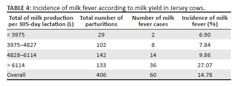 Results in Table 4 show that Jersey cows producing more than 6114 litres per 305-day lactation had significantly higher incidence of milk fever than those producing less than 6114 litres per 305-day lactation (p < 0.05). There was, however, no significant difference in the incidence of milk fever in Jersey cows in the first, second and third quartiles of milk production (p > 0.05).