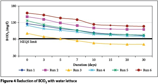 Biochemical oxygen demand (BOD5) is a measure of the oxygen consumption of microorganisms in the oxidation of organic matter. Settleable organics are rapidly removed in the experimental system by quiescent conditions, deposition and filtration. Attached and suspended microbial growth is responsible for the removal of soluble BOD5. The influent concentrations had a range of 95-160 mg/l, showing a medium strength sewage. The BOD5 effluent concentrations at the 30th day of each experiment run for the water hyacinth system were 70 mg/ (Run 1), 76 mg/ (Run 2), 45 mg/ (Run 3), 59 mg/ (Run 4), 63 mg/ (Run 5) and 79 mg/ (Run 6). The duckweed-based system, however, showed 81 mg/ (Run 1), 105 mg/ (Run 2), 60 mg/ (Run 3), 84 mg/ (Run 4), 84 mg/ (Run 5) and 110 mg/ (Run 6) at the 30th day of each experimental run. Similarly, water lettuce showed 91 mg/ (Run 1), 110 mg/ (Run 2), 65 mg/ (Run 3), 89 mg/ (Run 4), 93 mg/ (Run 5) and 119 mg/ (Run 6) at the 30th day of each experimental run.
