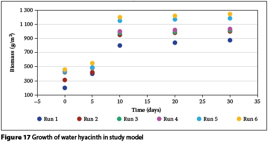Primary productivity and biomass are the important parameters. In general, the productivity of macrophytes is higher than that of terrestrial communities and agricultural crops because they do not suffer from a shortage of water. Macrophytes have a high tolerance for the fluctuations in environmental conditions and show high photosynthetic efficiencies. Uptake of nutrients by macrophytes is essential for their growth and reproduction. The high productivity of macrophytes enables substantial amounts of nutrients to be stored in plant biomass. Measurements of biomass were made after the 5th, 10th, 20th and 30th day of each experimental run for water hyacinth, water lettuce and duckweed. The plant biomass growth in the model was plotted and is shown in Figures 17, 18 and 19. It is quite clear from the results that there was a major rise in plant biomass in the first ten days. However, in the remaining twenty days it was much less when compared to the initial growth.