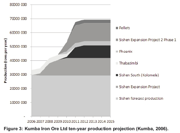 Kumba Iron Ore Ltd (see www.angloamericankum-ba.com) is a value-adding supplier of high quality iron ore to the global steel industry. It is the fifth-largest supplier of seaborne iron ore in the world, exporting more than 37 million tonnes per annum and providing more than 4 million tonnes to the local market (Kumba, 2010). The company has three mining operations in South Africa, namely Sishen Mine, Thabazimbi Mine, and Kolomela Mine. Both Sishen and Kolomela are long-life operations with current life of mine estimates of 18 and 29 years respectively. Thabazimbi Mine is nearing the end of its life, but Kumba has already undertaken a feasibility study on the Phoenix Project, adjacent to Thabazimbi, as a possible replacement. In 2006, Kumba published a growth strategy with an overall production projection of 70 million tonnes per annum in 2015, linked to the implementation of specific projects and mining assets (Kumba, 2006). See Figure 3 for the planned production projections.
