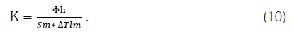 where φmaxis the heat transferred from a hot fluid to a cold fluid, qtc is the thermal flow of cold water, ATmax is the maximum variation of temperature, Κ is the global heat-exchange coefficient, Smis the average surface of heat exchange, and ΔTm is the average logarithmic temperature difference.