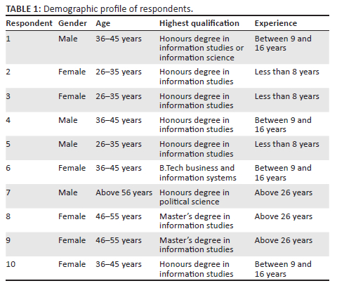 Table 1 shows that the study revolves around four male and six female respondents. While none of the respondents is under the age of 25 years, most of them fluctuated between 36-45 and 26-35 years with four and three respondents, respectively. Two respondents were between 46 and 55 years, followed by one respondent who is above 56 years. With regard to qualifications, most of the respondents (that is, seven) have obtained honours degrees in Information Studies. This is followed by two with master's degrees in Information Studies. One respondent each has a B.Tech in Business and Information Systems and one has an honours degree in Political Science. Four respondents have 9-16 years of experience, while three respondents have less than 8 years of experience, followed by three respondents who have more than 26 years of experience.
