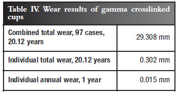 Compared with the internationally accepted mean wear tempo of virgin polyethylene of 0.1 mm/year8, the results with crosslinked cups in this series was 0.015 mm - a 6.6 times improvement in potential longevity (Table IV).