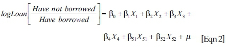 Where, represents the log of probability of the respondent getting a loan (p) while 1-p is the probability of not getting loan or applying for loan. It is also the dependent variable and a binary variable in which 1 denotes received or applied for loan and 0 denotes either as having not applied for any loan or having not received any loan. The X variables are the independent or explanatory variables defined as follows: