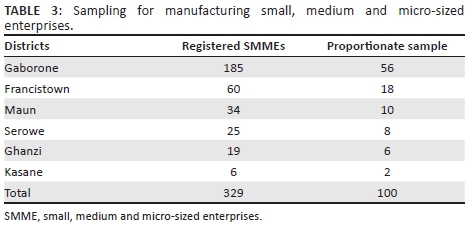 This study adopted stratified random sampling because it reduces sampling error (Bell & Water 2014). In this article, the researcher studied the manufacturing industry in Botswana. The strata are different districts in Botswana where the manufacturing industry is located. In this sampling technique, the researcher identified the relevant strata, namely, Gaborone Francistown, Maun, Serowe, Ghanzi and Kasane. In addition, random sampling with replacement was used to select a sufficient number of participants from each stratum, which is a reflection of the entire population of the manufacturing industry.