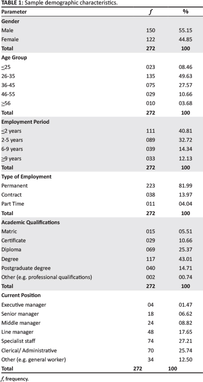 In terms of the demographic profile of the respondents, 55% (150) of the respondents were male and 45% (122) were female. Approximately 58% (185) of the respondents were aged below 35 years and 74% (200) of the respondents had been employed in the department for periods less than five years. With regard to the type of employment, 82% (223) of the respondents were under permanent employment within the department. In terms of the qualifications held, 43% (117) of the respondents were holders of a first degree and approximately 15% (40) of the respondents were holders of a postgraduate degree. Furthermore, 1.5% (4 ) of the respondents were executive managers, 7% (18) were senior managers, 9% (24) were middle managers, 18% (48) were line managers, 27% (74) were specialist staff, 26% (70) were clerical or administrative staff and 13% (34) occupied other auxiliary positions such as internships, security and general work.