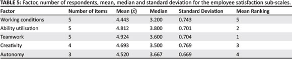 The summated means for the five employee satisfaction sub-scales (refer to Table 5) indicate average scores that lie between agree and strongly agree on the Likert Scale for all five factors. Teamwork (mean = 4.924) was ranked highest, followed by ability utilisation (mean = 4.812), creativity (mean = 4.693), autonomy (mean = 4.520) with working conditions (mean = 4.443) trailing the list. These findings denote that amongst these five factors, teamwork had the greatest impact on organisational performance with working conditions exerting the least impact.
