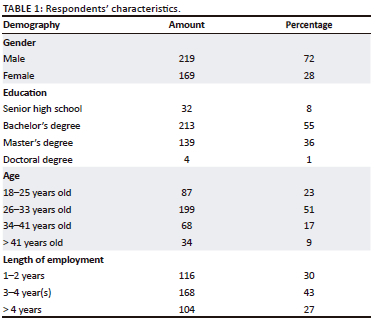 Most of the respondents in this study were male (72%); 55% of all respondents have bachelor's degree, with the majority of respondents in the age group of 26-33 years old (51%). The majority of respondents have been working for 3-4 years (43%). More details about the respondents' characteristics are shown in Table 1.