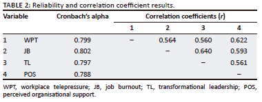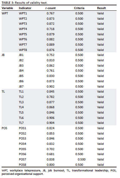All measurement variables show a reliable value for measuring the tested sample with Cronbach's alpha value on the Workplace Telepressure variable of 0.799, Job Burnout variable of 0.802, Transformational Leadership variable of 0.797 and POS variable of 0.788. The indicators used in the study showed valid results as a measuring instrument with a validity value exceeding 0.500. Furthermore, the correlation results from each variable all show a positive correlation, with a correlation between Workplace Telepressure and Job Burnout (r = 0.564; P < 0.01), Workplace Telepressure with Transformational Leadership (r = 0.560; P < 0.01) and the correlation of Workplace Telepressure with POS (r = 0.564; P < 0.01). More details on validity and reliability test are presented in Table 2 and Table 3.