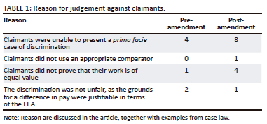 Although pay discrimination laws set out the requirements that must be met in order to succeed with a claim, claimants (also referred to as 'plaintiffs' in legal parlance) and HR practitioners often need expert assistance to interpret the requirements and determine whether a case has merit. This study was not aimed at critiquing the legislation. Instead, given that pay inequality is one of the main employment issues in South Africa (Fisher et al., 2021), we set out to clarify pertinent concepts related to pay discrimination, to inform HR practitioners and employees, including their union representatives. This is done by showing patterns in the reasons for judgements in equal pay litigation.
