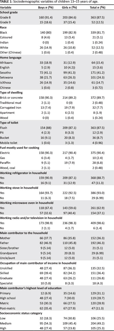 For approximately half of the children (n = 192; 46.3%), the father was indicated as the one contributing most income to the household, followed by the mother (n = 152; 36.3%). Most of the main contributors to the household were skilled workers (n = 151; 36.4%) (clerks, office assistants, sales persons), followed by unskilled workers (n = 135; 32.5%) (domestic workers, cleaners, gardeners and contract workers). Only 47 (11.3%) of the children's parents who were contributors had post-matric education. Based on the parent's highest level of education and occupation, 204 (49.2%) of the children were categorised to be of medium socioeconomic status.