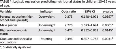 On logistic regression (Table 4), the odds of being underweight were higher in boys and less likely in children with a medium to high SES. Children whose parents had a level of education of high school, matric and post-matric were more likely to be overweight. Additionally, children whose parents had graduate or specialist occupations were less likely to be stunted.