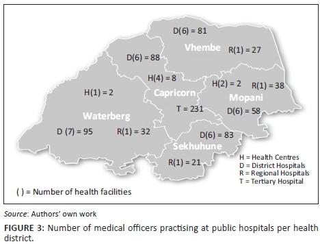 RESULT: The mean age of the 887 medical doctors was 40.1 ± 11.2 years (range 24-79 years). Sixty per cent of the doctors were male, 66% were aged ≤ 45 years and 84% were African. Most of the doctors (86%) were medical officers, of which 55% had < 5 years working experience. Overall, the doctor-to-population ratio for the five districts in the province was 16.4/100 000, with Capricorn (33.7/100 000) and Waterberg (20.2/100 000) recording the highest ratios. A large proportion (43%) of medical officers are employed in the Capricorn District, of which 71% were practising at the tertiary hospital