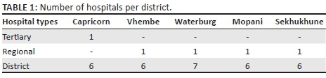 The Limpopo Province is predominantly rural and has an estimated population of 5.5 million people.24 The province is strategically located in the northern part of SA, with the Zimbabwean border to the north, Botswana to the west and Mozambique to the east. The province has five districts, namely Capricorn, Vhembe, Mopani, Sekhukhune and Waterberg. Each district is further subdivided into administrative functional municipalities. The total number of public hospitals per district is shown in Table 1. The province has one tertiary hospital, which is a complex comprising two hospitals situated 30 km apart in Polokwane and Mankweng. The complex delivers tertiary care and deals with some secondary and primary care cases.