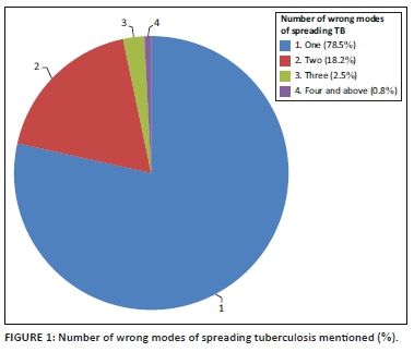 The majority (87.9%) of the household members aged 15 years and above who had ever heard of TB knew that TB is spread through the air when coughing or sneezing. Wrong modes of spreading TB such as touching someone who has TB, sharing food or utensils with someone who has TB or unprotected sex as well as mosquito bites were also mentioned by the remaining 12% of the respondents. As shown in Figure 1, 78.5% mentioned one wrong mode of spreading TB, while 18 respondents mentioned two wrong modes of spreading TB. Less than 5% mentioned or identified at least three wrong modes of spreading TB. Touching someone who has TB or sharing utensils with someone who has TB was mentioned by 6% of the respondents, while sharing food with someone who has TB, sexual contact or mosquito bites was mentioned by less than 3%. Figure 1 shows the number and percentage of wrong modes of spreading TB mentioned.