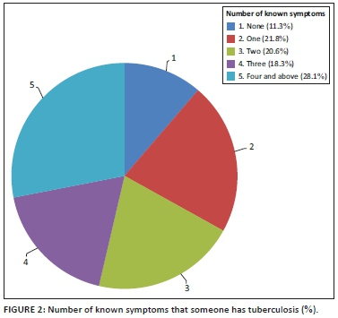 Concerning the knowledge of symptoms for someone for who has TB, 28.1% of the respondents knew at least 4 of the 9 symptoms. One in five knew between 1 to 3 symptoms, while 11.3% knew none of the symptoms. Coughing continuously for 2 weeks was the most known symptom mentioned by 52% of the respondents followed by sweating at night mentioned by 48.7%. Coughing with sputum, loss of appetite and weight loss were mentioned by between 30.4% and 38.9%. Fever, chest pains and tiredness or fatigue were mentioned by between 10.5% and 14%, while blood in sputum was mentioned by 20.8% (Figure 2). Figure 2 shows the number and percentage of known symptoms that someone has TB.