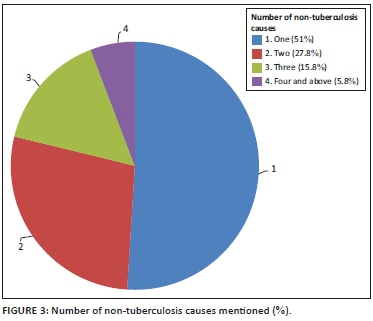 With respect to what causes TB, 41% of the respondents knew that TB is caused by microbes or germs or bacteria found in the air. More than half of the respondents were of the view that TB is caused by other causes including inheritance from parents, smoking, alcohol drinking, exposure to cold temperatures and dust. Smoking (32.5%), dust (29.7%) and alcohol consumption (15.8%) to a larger extent were the major culprits believed to cause TB. The other non-causes of TB were mentioned by between 2.9% and 8.7%. However, only less than 5% of the respondents who associated causes of TB with wrong modes associated TB with at least 4 wrong causes, while the majority (51%) associated it with one wrong cause (Figure 3). Figure 3 depicts the number and percentage of non-TB causes mentioned.