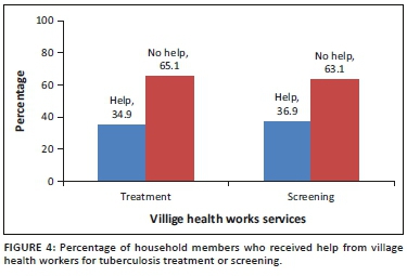 Responding to who helped the household members to be on TB treatment, the household head reported that a third (34.9%) of those diagnosed with TB were helped by the VHW. Among the household members aged 15 years and above, more than a third (36.9%) reported that they were advised by the VHW to go for TB screening (see Figure 4). One reported about advice to go for TB screening (self-reported), while the other reported about help to get TB treatment (household head). However, both reports were similar in terms of the utilisation of services of the VHW which is estimated at around 33%. Figure 4 presents the utilisation of the VHWs' TB services by community members and the percentage of household members who received help from VHWs for TB treatment or screening.