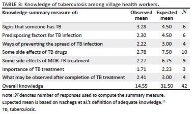 Generally speaking, there is inadequate TB knowledge among Lesotho's VHWs. The disparity between observed mean knowledge and expected knowledge is huge. The low utilisation of the VHWs' TB services among community members was not surprising because of inadequate TB knowledge among VHWs. Understandably, community members served by a VHW with inadequate knowledge are less likely to utilise VHWs' TB services. This finding confirmed what was suggested by the literature, namely that adequate knowledge among VHWs would translate into high or better utilisation of VHWs' services.13,14,15