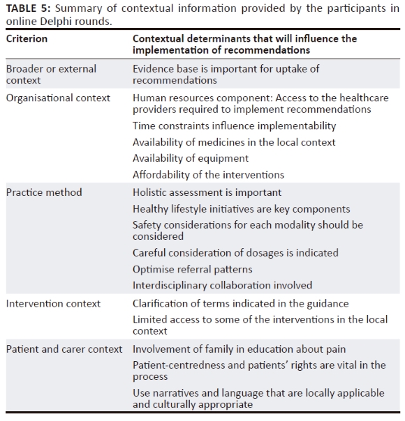 Table 5 provides a summary of the contextual determinants listed by participants listed in the online Delphi rounds.