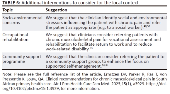 The recommendations support a person-centred approach to care and collaborative decision-making with the patient and the multidisciplinary team. The main outcome of the collaboration is the formation of a therapeutic alliance between the healthcare provider and the patient.35 With the given foundation, the healthcare provider can identify the patient's priority concerns about CMSP, while considering the individual patient's cultural beliefs, previous experience, values and beliefs regarding CMSP, to guide management and assessment decisions and to optimise the impact of the proposed interventions.35 In SA, with its diverse culture and language, the focus on the patient's beliefs regarding pain is important, because the meaning and expression of pain is influenced by culture.36 Despite the importance of patient-centred care, the panel raised some concerns regarding human resource constraints, limited access to healthcare providers and limited available consultation time in PHC. The given contextual impediments are confirmed by existing literature8,37 and pose a threat to the approach to care as well as the implementation of several assessment and management options.