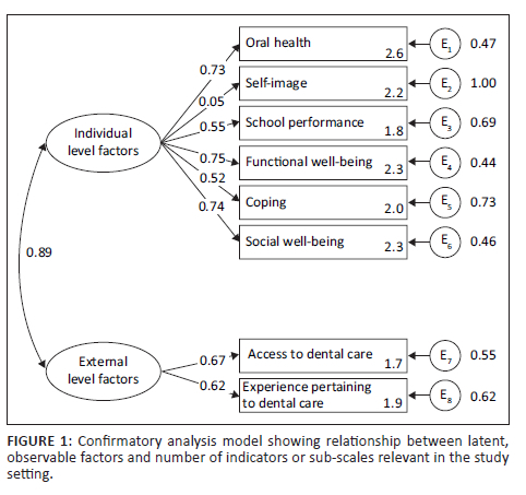 Confirmatory factor analysis was used to validate the relationships following the EFA. The relationships were also based on the priori theory of the relationship between individual and external factors influencing the OHRQoL. According to Kline,22 the standardised loadings (r2) should be at least 0.70 to display good convergent validity. The acceptable cut-off points are from 0.5. The dental care access (0.67) and the dental care experiences (0.62) showed good convergence to the external level latent factor. Likewise, the oral health, functional well-being and the socio-emotional well-being had the highest convergence (r2 > 0.70) to the individual latent factor.