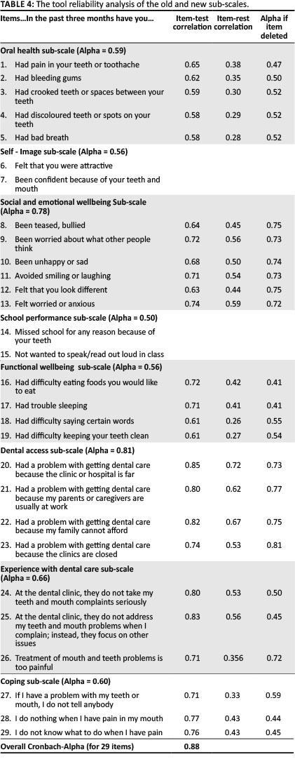 The 29-item, South African version exhibited acceptable properties. The M-COHIP is the result of the contextual findings of a prior qualitative inquiry, which suggested the addition of three more sub-scales to capture the relevant factors important in the setting.14 These new sub-scales 'Dental care access', 'Experience with dental care' and 'Coping' were added, and the final tool displayed very good reliability and validity.