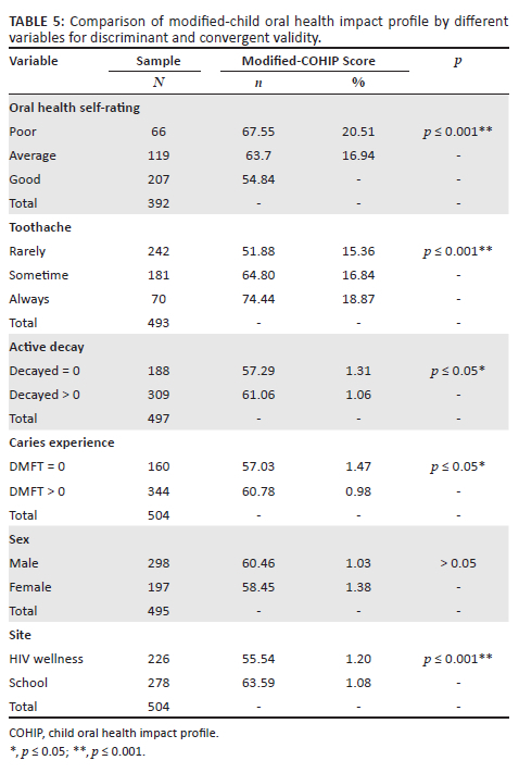 Discriminant validity on groups was expected to demonstrate higher M-COHIP scores with a higher caries prevalence and with toothache reports. As depicted in Table 6 when adjusted for potential confounders such as age, sex, group, oral health self-rating and toothache, the caries prevalence and toothache were significant predictors of M-COHIP scores. The participants recruited from the school sites had a higher caries prevalence when compared with those in the wellness site, and the p-value was significant (p < 0.05). Age and sex were not covariates of modified COHIP scores in Johannesburg.