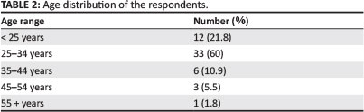 There were 55 respondents (57.8% response rate), mainly from Polokwane Hospital (n = 22; 40%) and Mankweng Hospital (n = 16; 29%), as is shown in Table 1. Most of the respondents were female (61.8%; n = 34), whilst 38.2% (n = 21) were male. The age distribution of the respondents is shown in Table 2; the majority (n = 45; 82%) of the respondents were young pharmacists aged 34 years or younger.