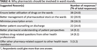 The reasons advanced for pharmacists being involved centred around ensuring better utilisation of drugs on the ward through interaction with doctors and support for nurses; better management of pharmaceutical stocks on the wards in order to avoid expiry of ward stock; minimising prescribing errors by doctors through consultation; better patient counselling before the patients are discharged; providing a pharmacist's perspective on patient problems through proper clinical pharmacy assessment; and being ready to address any drug-related questions from other health professionals. The distribution of the responses is summarised in Table 4.