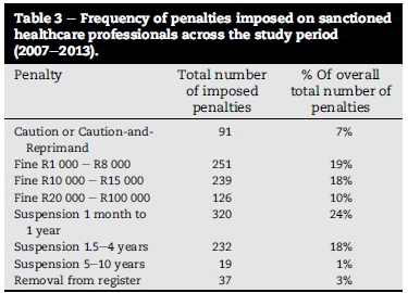 The next set of quantitative results focuses on the frequency of the various penalties imposed on sanctioned healthcare professionals across the total study period for all professional boards (Table 3). These results provide indications of the frequency, type and extend of penalties imposed by the HPCSA on sanctioned healthcare professionals.