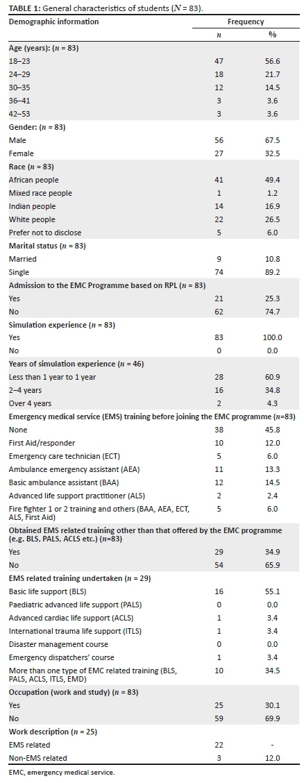 Nevertheless, clinical simulation is widely valued and forms an integral component of paramedic student training in several regions of the world, including Europe, Africa, Asia and the United States of America (Karkada et al. 2019). This is because it creates a satisfying, safe and engaging space where active and meaningful learning of critical thinking and clinical skills take place. Acknowledging this, it is not surprising for this instructional design to be associated with paramedic students' enhanced satisfaction, competence, self-confidence, and ability to safely apply learnt skills and knowledge in clinical practice (Rodriguez et al. 2017). The outcome of a study by Williams et al. (2016) that compares learners' satisfaction with simulation between Australian and Jordanian paramedic university students confirms this. Even though there were differences in satisfaction levels, the paramedic students were in the main satisfied with clinical simulation regardless of their socio-cultural backgrounds. Despite this, most research on clinical simulation focus on its effectiveness in achieving training goals with areas such as learners' confidence, competence and satisfaction with stimulation training much neglected (Adamson, Kardong-Edgren & Willhaus 2013). Hence, this study investigated the paramedic students' self-confidence and satisfaction with clinical simulations of an emergency medical care (EMC) programme at a university in South Africa.