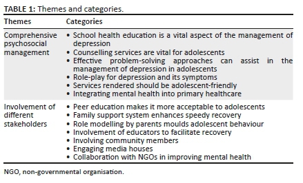 Collaboration with non-governmental organisations in improving mental health: Participants indicated that the psychosocial management of depression in adolescents requires collaborative activities of different bodies, such as NGOs, as captured in the following excerpts: 'Like at the clinic, we need these NGOs that are working with the department like LOVE LIFE' (Focus group 1, participant 2, female); 'You have to make sure that they visit adolescents at schools or at home so that they can assist them with their needs, this will reduce their depressive symptoms' (Focus group 1, participant 3, female).