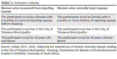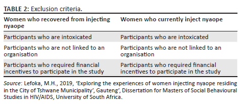 The population in this study were women above the age of 18 years who reside in the CoT Municipality with a history of injecting nyaope for more than 6 months. The participants were accessing harm reduction services at COSUP sites across the CoT. The purposive-sampling method was used to recruit participants from COSUP needle and syringe exchange programme (NSP) and opioids substitute therapy (OST) social work caseload. All women accessing services at COSUP with a history of injecting nyaope who meet inclusion criteria were invited through the assistance of the site social workers to participate in the study. The researcher sampled 24 participants from the population with the help of site social workers. Fifteen women who were currently injecting nyaope and nine women with a history of injecting nyaope were interviewed. Inclusion and exclusion criteria were followed during the sampling process (Table 1 and Table 2). The researcher was more interested in interviewing women who had a rich life experience of the phenomenon being studied, in this case, experience of using nyaope. Injecting nyaope for 6 months was deemed sufficient to determine whether or not a person has extensive experience, those with less than 6 months, were not considered.