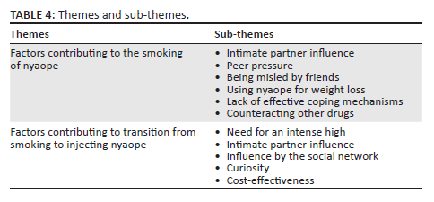 RESULTS: Intimate partner influence (IPI), peer pressure, being misled by friends, weight loss, lack of effective coping mechanisms and counteracting other drugs contributed to women smoking nyaope. Additionally, a need for an intense high, IPI, influence by the social network, curiosity and cost-effectiveness contributed to women transitioning from smoking to injecting nyaope.