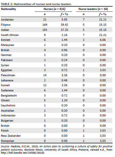 The data in Table 2 indicates the nurse respondents were from diverse cultural backgrounds; the majority (n = 164) were from the Philippines, followed by India (n = 155). However, nurse leaders were predominantly from Jordan (n = 7; f = 21.21 %), South Africa (n = 7; f = 21.21 %), the Philippines (n = 5; f = 21.21%) and India (n = 5; f = 21.21%). The least represented were nurse leaders from Egypt, Finland, New Zealand and Romania (n = 1; f = 3.03%). Patient admissions data revealed that 75% of patients treated in both study hospitals A and B to be Emirati and 25% non-Emirati (from 19 different nationalities encountered in hospitals). As a result of this diversity, language barriers may have existed because of the majority of nurses and nurse leaders not being able to converse in the Arabic language (n = 338 nurses and n = 22 nurse leaders). Only 70 nurses and 10 nurse leaders spoke an Arabic dialect - Emirati, Jordanian, Syrian, Sudanese and Palestinian. This illustrates that important patient information may not be retrieved and shared because of language deficits, and because competent translators may not be readily available (Basu, Costa & Jain 2017).