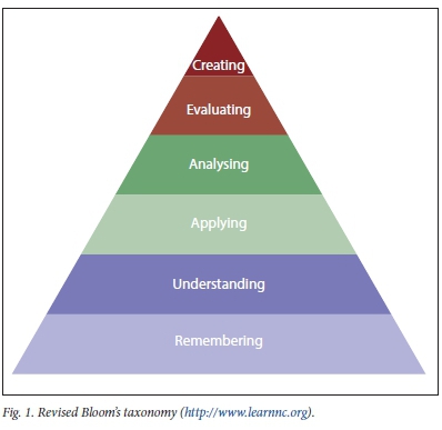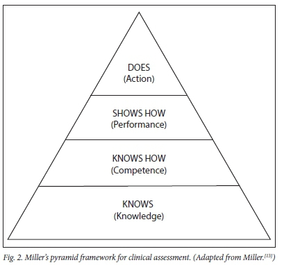 While students are at a distant learning site, academics need to determine if learning does in fact occur, and if CBE has achieved its intended outcomes. Therefore, assessment of CBE is important, as it drives learning[10] and inspires students to set higher standards for themselves.[11] The main reasons for assessments in health sciences education are to optimise student capabilities and protect the public against incompetent clinicians.[11] Assessments should therefore test knowledge, technical skills, clinical reasoning, professionalism, communication skills and reflection.[11] In an academic setting, assessments are formal and well structured, taking the form of tests and assignments. To test knowledge, academics in various disciplines use Bloom's model for written assessments, starting with testing lower-order thinking levels of remembering, understanding and applying, and continuing to higher-order thinking levels of analysing, evaluating and creating (Fig. 1).[12] Similarly, academics use Miller's model to assess clinical competence, starting with cognition-testing knowledge (knows), competence (knows how), performance (shows how) and action (does) (Fig. 2)[13] - conducted within a closed academic clinical training environment. However, development of competence in different contexts may occur at different rates, depending on a student's ability to adapt to various clinical settings.[11] The question then arises: can the methods used in formal academic settings be applied to test learning that occurs in community-based settings?